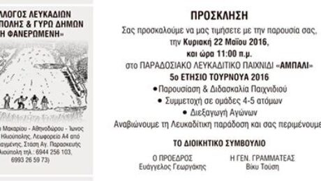 Η πρόσκληση και αφίσα του 5ου Ετήσιου Τουρνουά του παραδοσιακού Λευκαδίτικου παιχνιδιού «ΑΜΠΑΛΙ» που θα πραγματοποιηθεί την Κυριακή 22 Μαϊου 2016 και ώρα 11:00 π.μ. στην Κάτω Ηλιούπολη Εθνάρχου Μακαρίου – Αθηνοδώρου & Ιωνος.